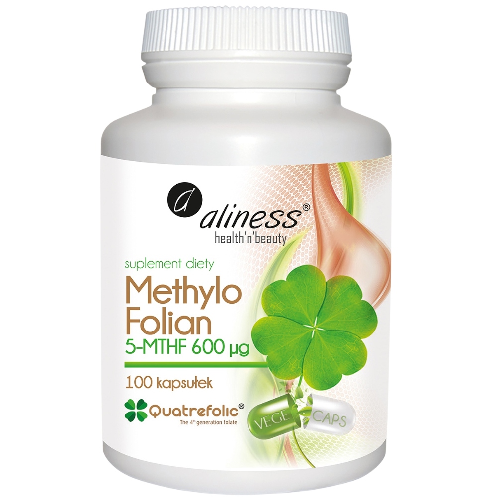 METHYLO FOLIAN 600 µg marki ALINESS to naturalne źródło folianu w opatentowanej postaci Quaterfolic®.Określenie "Kwas foliowy" obejmuje wszystkie formy folianów. Jeśli słowo „folian” brzmi dla Państwa w języku angielskim jak „liście”, to nie przypadek. Słowa maja wspólne korzenie (łacińskie słowo folium, oznaczające "liść"), co pomaga przypomnieć nam, że żywność w postaci zielonych roślin może być jednym z najbogatszych źródeł folianu.Syntetyczny kwas foliowy - kwas foliowy pobierany z żywności aby uzyskać pełna skuteczność metaboliczną musi zostać zmetabolizowany do 5-metylotetrahydrofolianu (5-MTHF). Większość przyjmowanego folianu pochodzi z syntetycznej wersji kwasu foliowego w suplementach oraz dodawanego do żywnościDzisiaj wiemy, że kwas foliowy podlega złożonemu metabolizmowi oraz że wśród populacji istnieją różnice w zakresie zdolności do skutecznego metabolizowania kwasu foliowego do jego bioaktywnej formy (1,2).