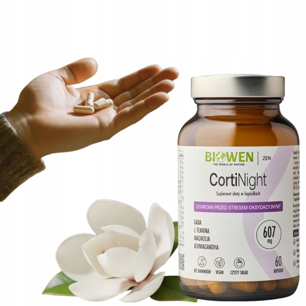 CortiNight Biowen to suplement diety stworzony z myślą o osobach, które chcą wyciszyć organizm przed snem, zredukować napięcie i wspierać naturalną regenerację nocną. W jego skład wchodzą ekstrakt z kory magnolii standaryzowany na honokiol i magnolol, naturalna L-teanina 98%, ashwagandha standaryzowana na 10% witanolidów, GABA oraz witaminy z grupy B i minerały w formie diglicynianów. Synergia tych składników działa uspokajająco, pomaga zmniejszyć natłok myśli i wspiera zdrowy, głęboki sen, bez uczucia otępienia następnego dnia. To doskonały wybór dla osób zestresowanych, niewyspanych oraz wszystkich, którzy chcą zasypiać szybciej i budzić się bardziej wypoczęci.