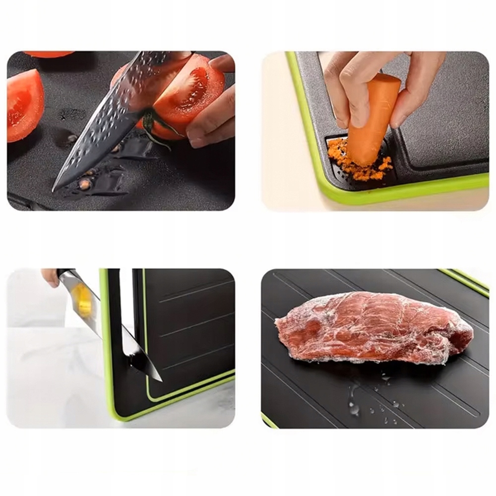 Szybkie i Bezpieczne Rozmrażanie Dzięki innowacyjnej powierzchni do rozmrażania, deska pozwala na szybkie i bezpieczne odmrażanie mięsa, ryb czy innych mrożonych produktów bez użycia mikrofalówki czy gorącej wody. To oszczędność czasu i większa wygoda w kuchni.
