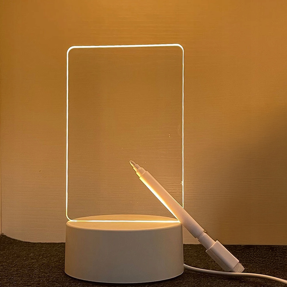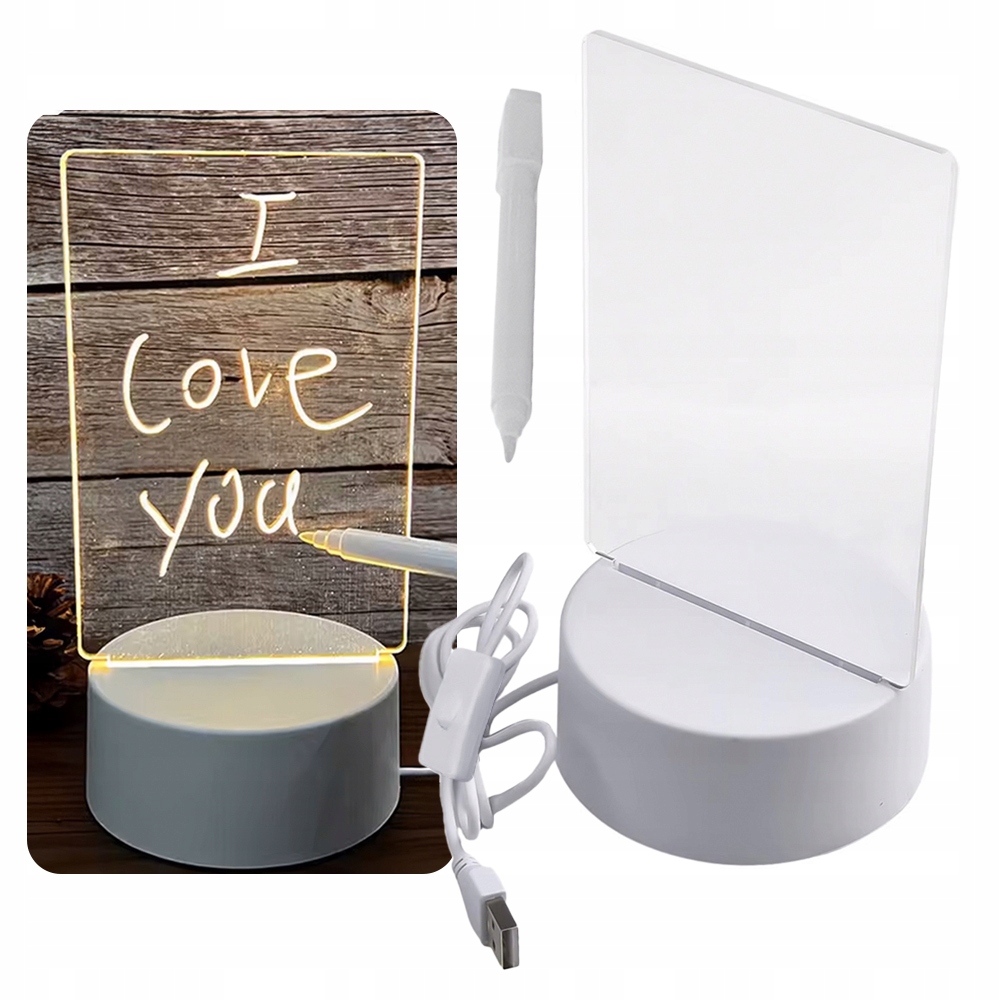 W zestawie znajduje się jednokolorowa świecąca podstawa oraz przezroczysta tablica akrylowa, na której można pisać dowolne wiadomości, rysunki czy notatki za pomocą dołączonego markera. Tablica świeci w ciepłym, białym świetle, co tworzy przyjemną atmosferę. Dzięki zasilaniu przez kabel USB, urządzenie jest wygodne w użyciu i energooszczędne.