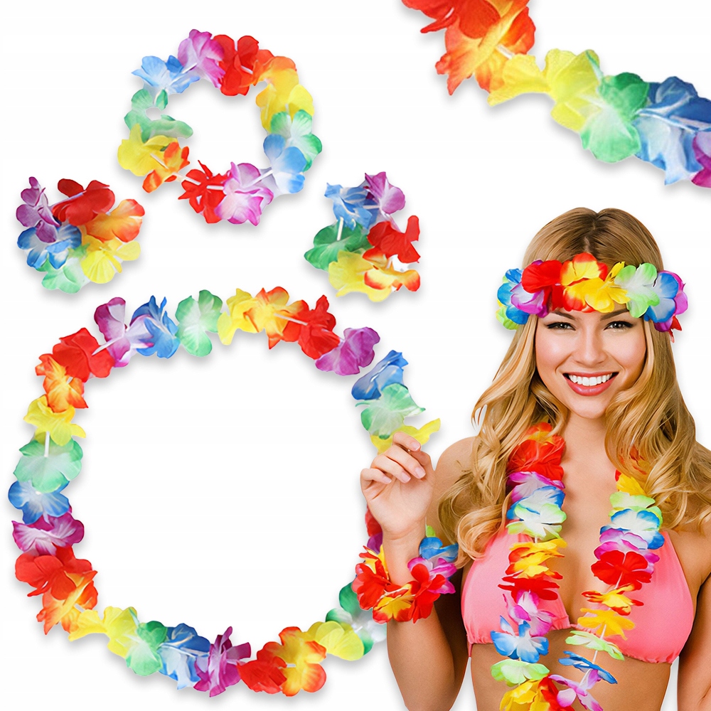 Wprowadź hawajski klimat na każdą imprezę! Ten barwny zestaw to idealny dodatek do przebrania na plażę, karnawał, garden party, wieczór panieński czy letni festyn.
