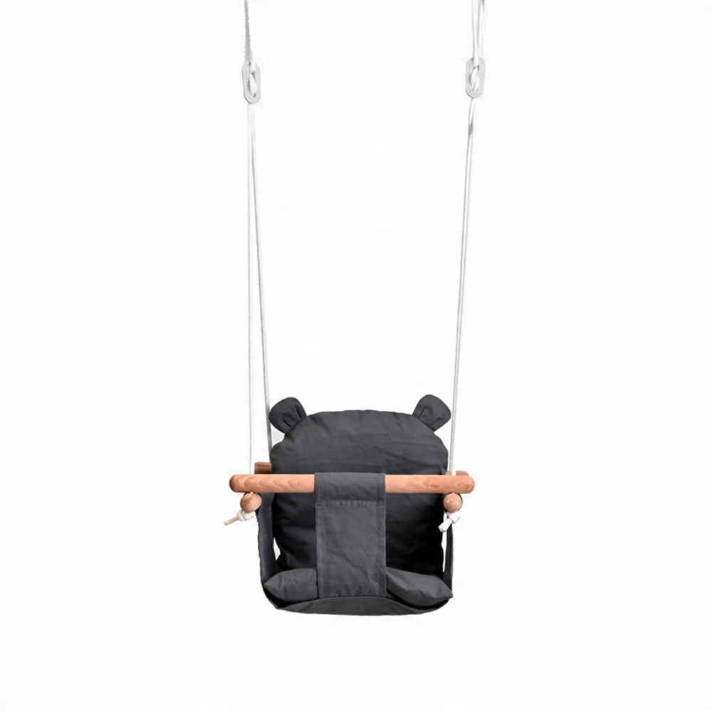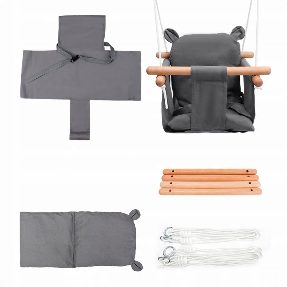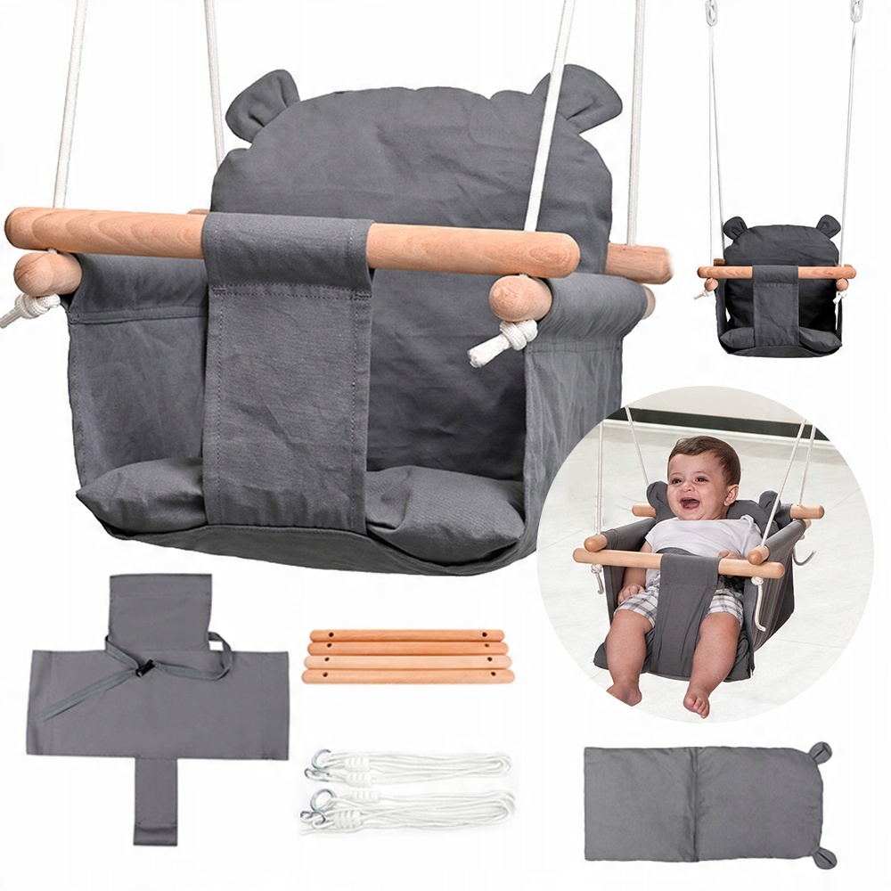 Drewniana Huśtawka Miś Kubełkowa Pokojowa Szara Materiałowa Dla Dziecka