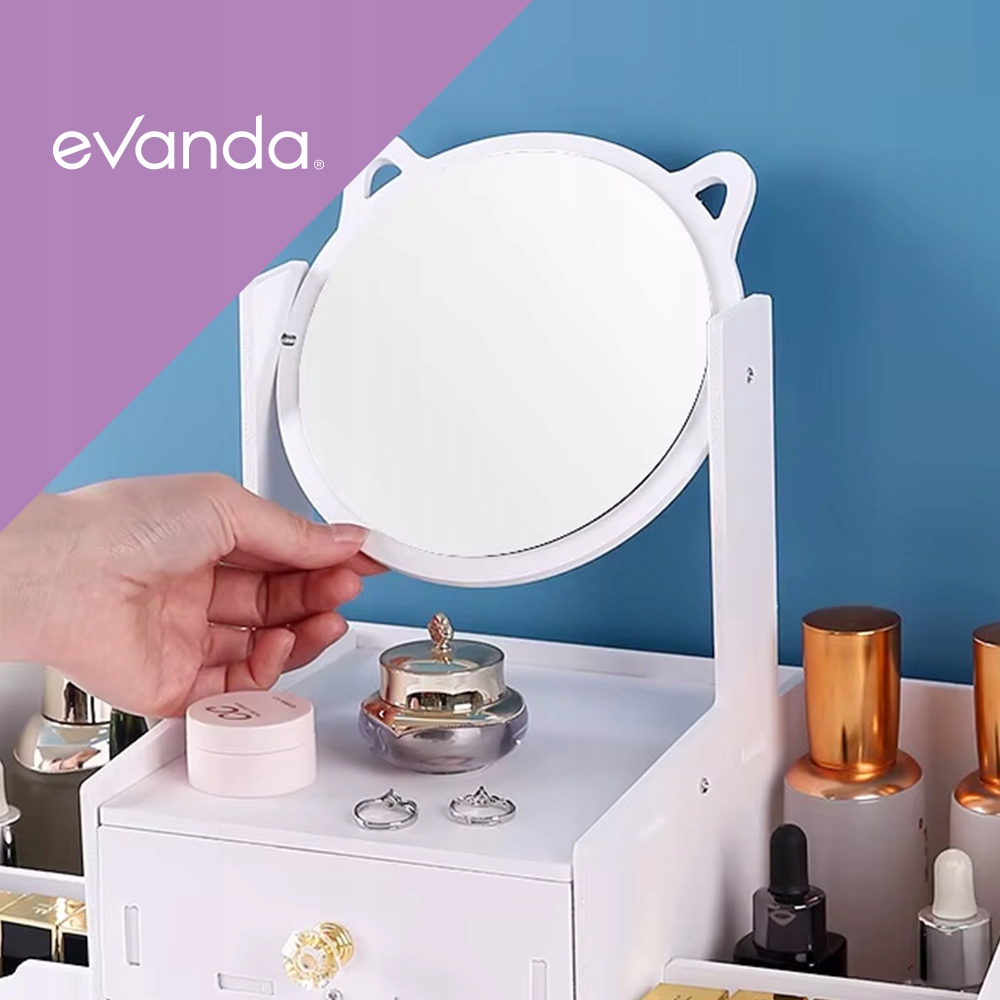 Stylowa i funkcjonalna toaletka eVanda to idealne rozwiązanie dla osób, które cenią elegancję, porządek i wygodę w codziennej pielęgnacji. Jej uroczy design z okrągłym lusterkiem w kształcie kotka sprawia, że doskonale wpisuje się w estetykę nowoczesnych wnętrz - zarówno w sypialni, łazience, jak i garderobie.