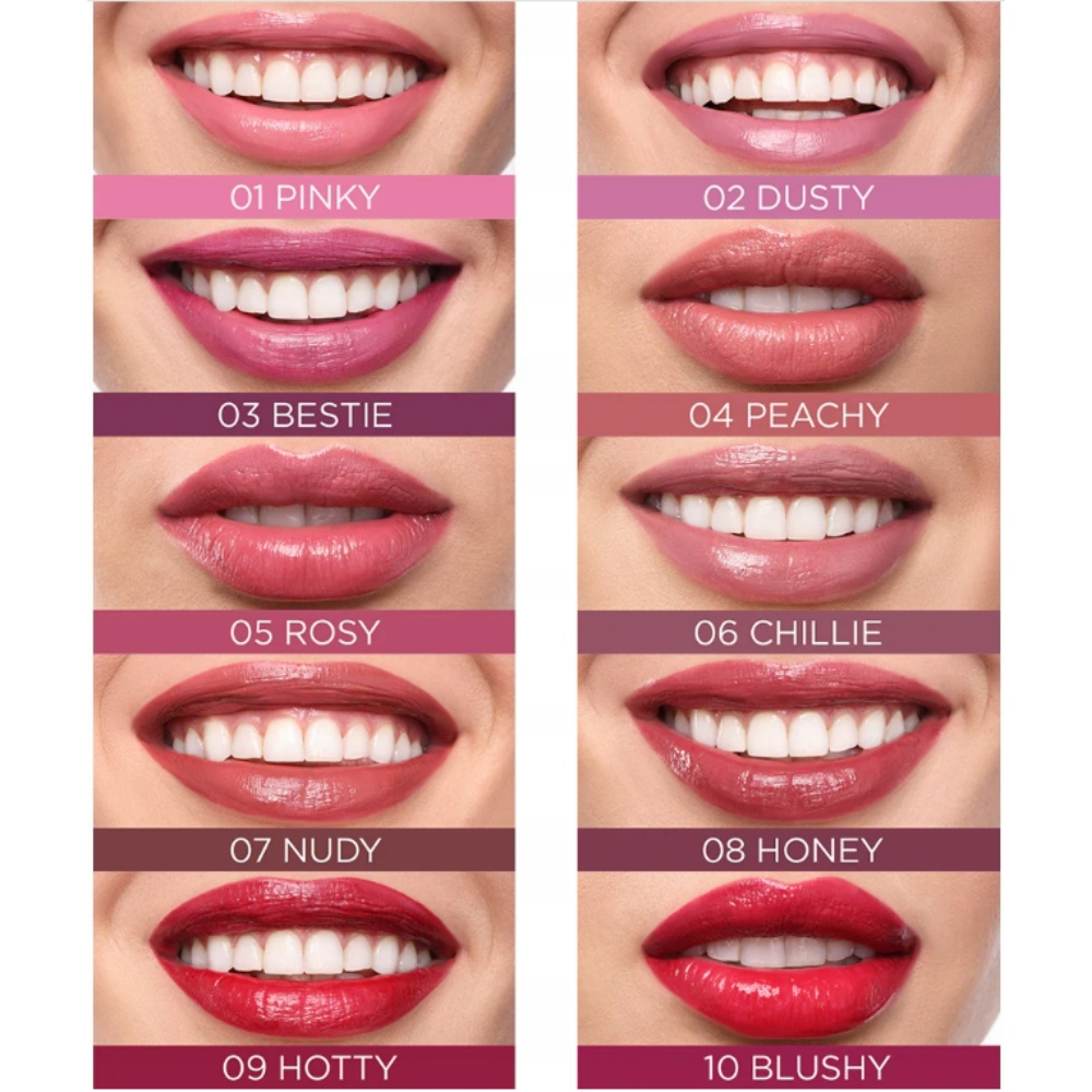 - składniki nawilżające – dbają o komfort noszenia, zapobiegają uczuciu suchości i zapewniają efekt gładkich, miękkich ust.