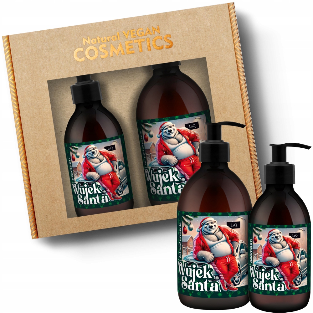 Oto wegański zestaw kosmetyków naturalnych dla mężczyzny, składający się z żelu pod prysznic oraz szamponu do włosów. Zestaw Wujek Santa to świąteczny must-have pod prysznic! Żel pod prysznic pachnie jak świeża choinka polana syropem klonowym z reniferowej karczmy, a szampon doda Twoim włosom blasku godnego gwiazdy betlejemskiej. Wujek Santa wie, jak rozpieszczać – po tym duecie będziesz czysty jak śnieg na biegunie i gotowy na świąteczne psoty!
