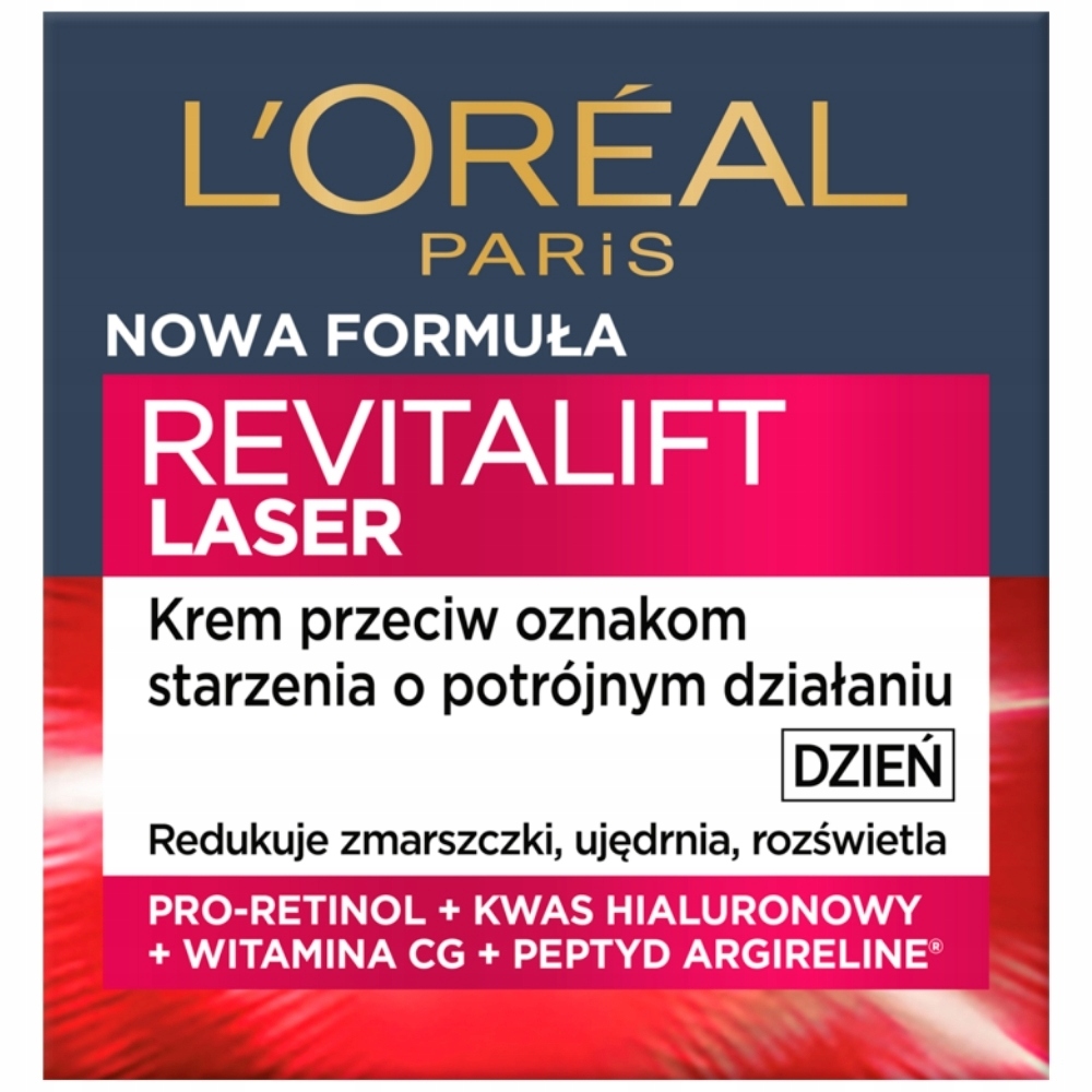 Krem przeciwzmarszczkowy na dzień o potrójnym działaniu L'Oréal Paris Revitalift Laser z pro-retinolem, kwasem hialuronowym, witaminą Cg oraz peptydem.