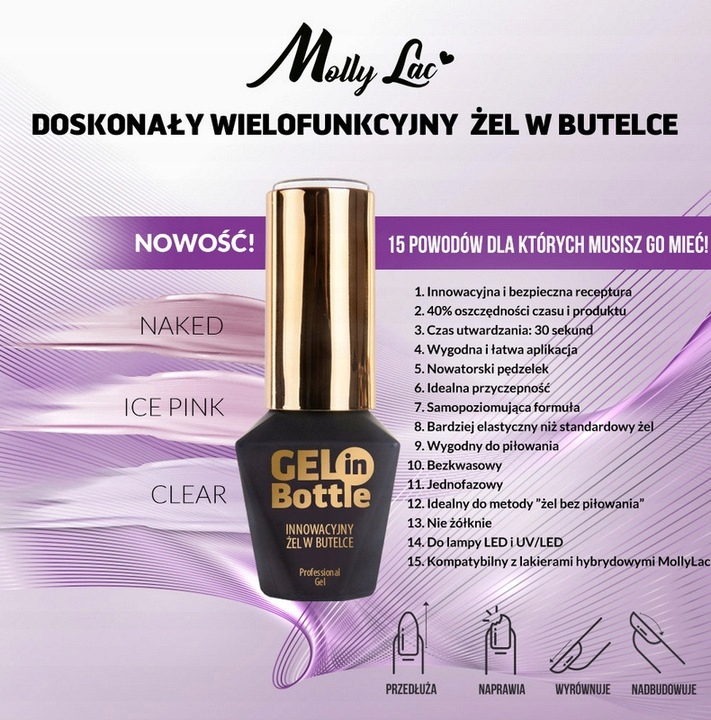 MollyLac Gel In Bottle Wielofunkcyjny Żel Do Przedłużania Paznokci Clear