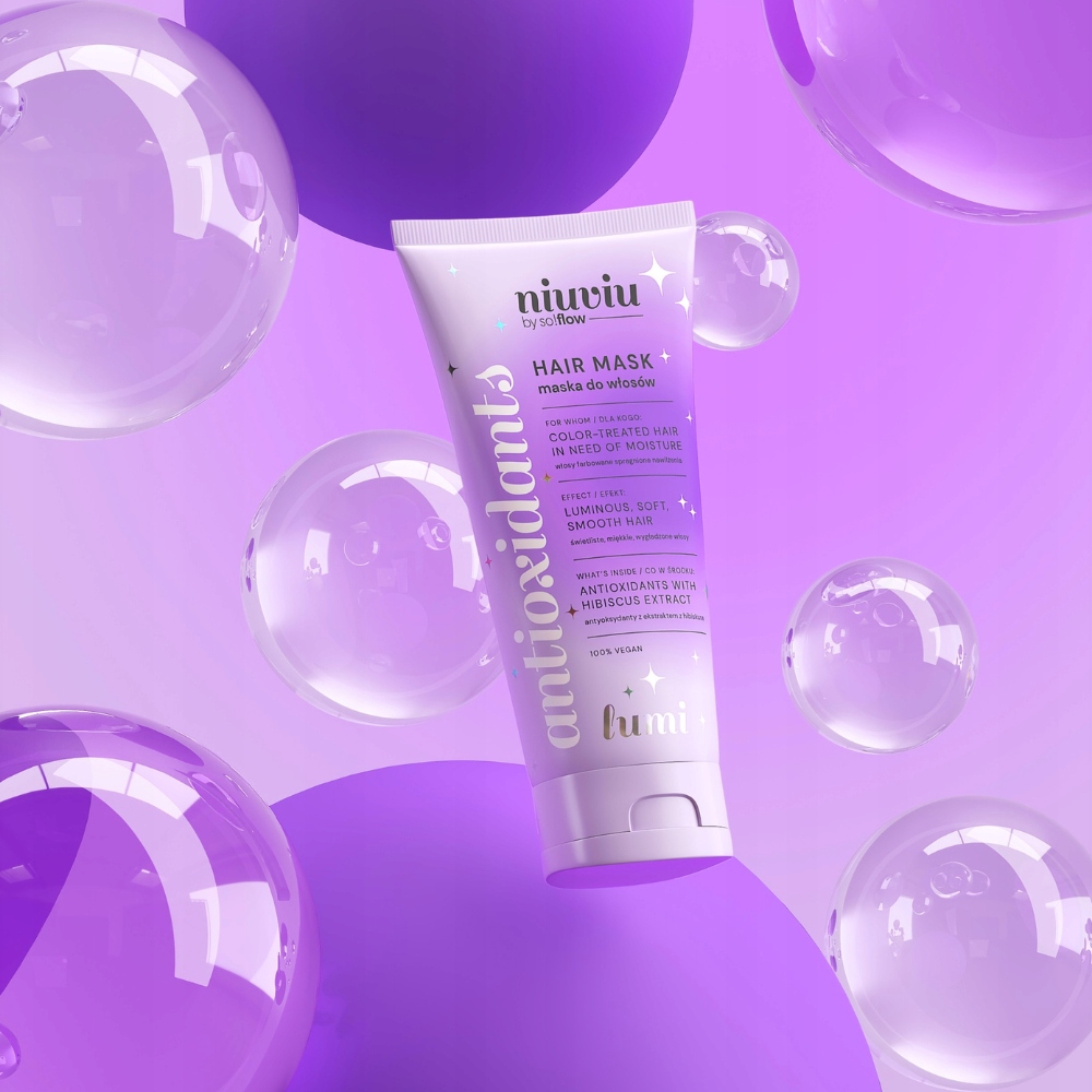 Niuviu Lumi Hair Mask to maska do włosów farbowanych, która intensywnie nawilża, odżywia i chroni kolor. Dzięki antyoksydantom z ekstraktu z hibiskusa przywraca pasmom miękkość, gładkość i świetliste wykończenie, jednocześnie chroniąc intensywność koloru na dłużej. Maska Lumi głęboko odżywia i nawilża włosy farbowane. Antyoksydanty z hibiskusa chronią intensywność koloru, zapewniając włosom miękkość, gładkość i zdrowy wygląd. Regularne stosowanie sprawia, że włosy są bardziej odporne na uszkodzenia i pełne blasku.