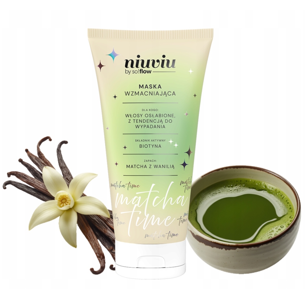 Zestaw „matcha time” to linia wzmacniających produktów do włosów, które przywracają im zdrowie i kondycję. Idealna dla każdego rodzaju włosów, zwłaszcza tych osłabionych, wypadających, puszących się i potrzebujących regeneracji. Zawiera biotynę i ekstrakt z matchy, które wspierają wzrost i wzmocnienie włosów, a także chronią je przed szkodliwym działaniem czynników zewnętrznych. Przyjemny zapach matchy z wanilią dodaje pielęgnacji przyjemności i relaksu.