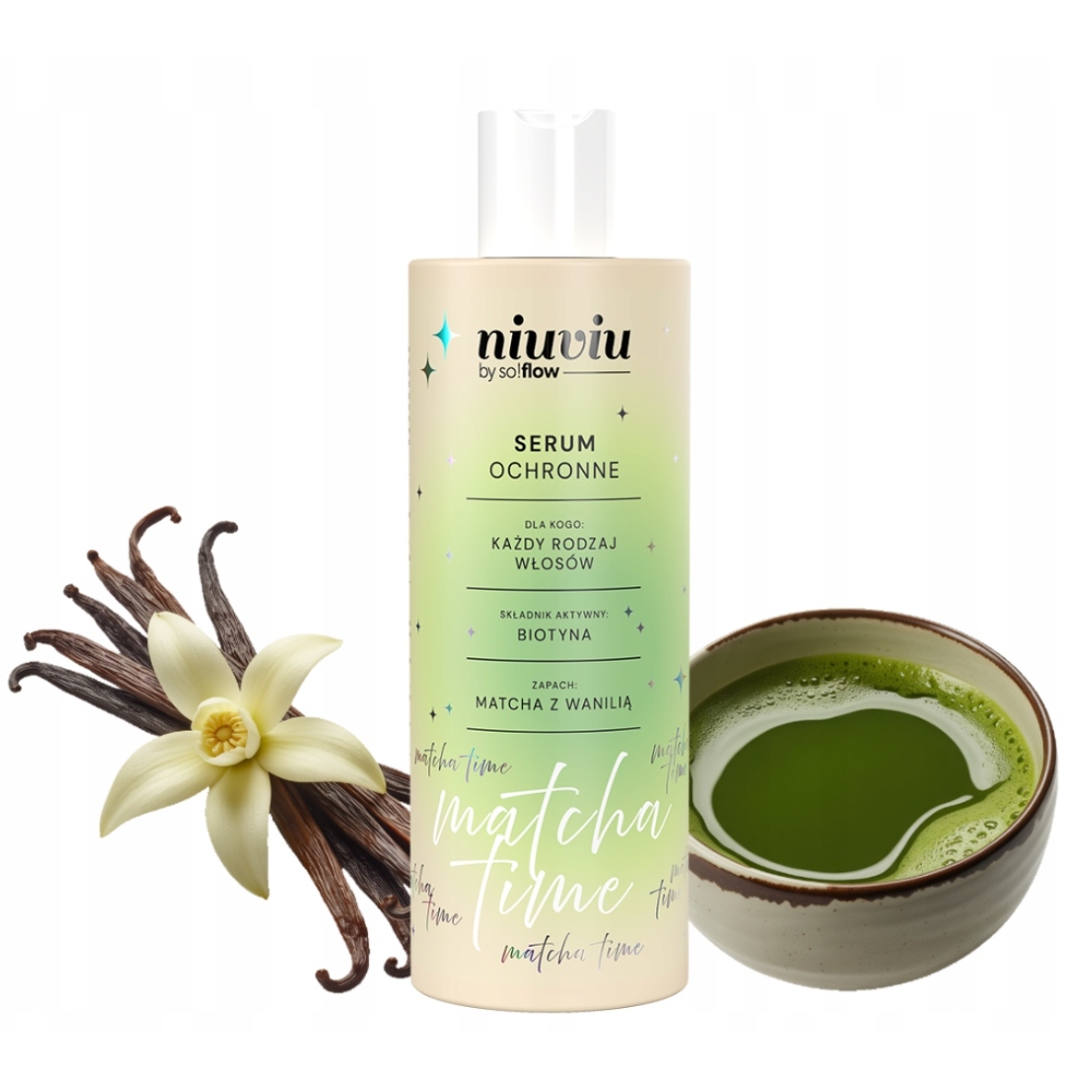 Serum nie tylko chroni, ale także uprzyjemnia pielęgnację – delikatny zapach matchy i wanilii otula zmysły i pozostaje na włosach subtelnie po aplikacji. Kosmetyk nie wymaga spłukiwania i jest doskonały do codziennego stosowania – wystarczy kilka kropel przed suszeniem, by cieszyć się gładkimi, zdrowo wyglądającymi włosami pełnymi blasku.