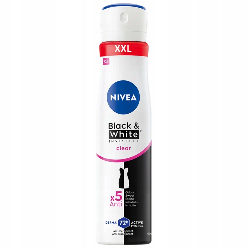 Wypróbuj antyperspirant w spray'u Nivea Black&White Invisible Clear zapewniający ochronę przed białymi śladami na czarnych ubraniach i zapobiegający powstawaniu żółtych plam na białych ubraniach. Niezawodna, 72-godzinna ochrona antyperspirantu, która jednocześnie dba o Twoją skórę pod pachami. Produkt zapewnia pewną ochronę przed potem i nieprzyjemnym zapachem bez ryzyka pobrudzenia Twoich ulubionych ubrań. Formuła nie zawiera alkoholu etylowego, a jej tolerancja dla skóry została potwierdzona dermatologicznie. Ochrona 5w1 przed nieprzyjemnym zapachem, potem, podrażnieniami, żółtymi plamami na czarnych ubraniach i białymi śladami na czarnych ubraniach. Wyjątkowa ochrona Derma Active Protection teraz z ochroną przez 72 godziny.