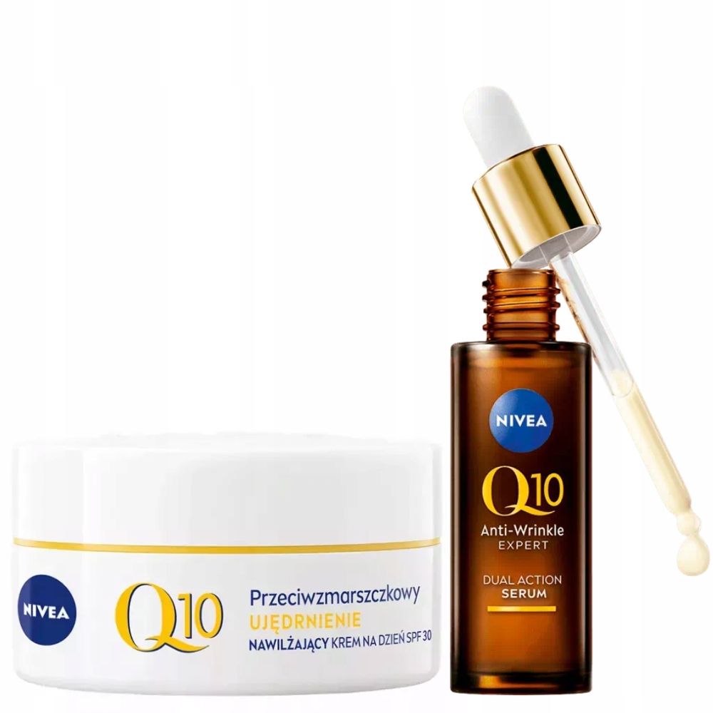 NIVEA Przeciwzmarszczkowy Ekspert Q10 - podwójnie aktywne serum dzięki innowacyjnej formule z technologią antyglikacyjną działa dwutorowo: Redukuje nawet najgłębsze zmarszczki - zawiera najwyższą w naszych produktach koncentrację Czystego Koenzymu Q10 zapobiega powstawaniu nowych - zawiera technologię antyglikacyjną z GLYCOSTOP, który działa jak tarcza, chroniąc skórę przed szkodliwym działaniem procesów glikacji.