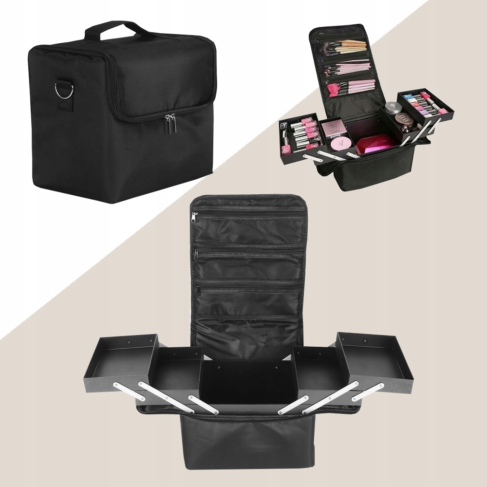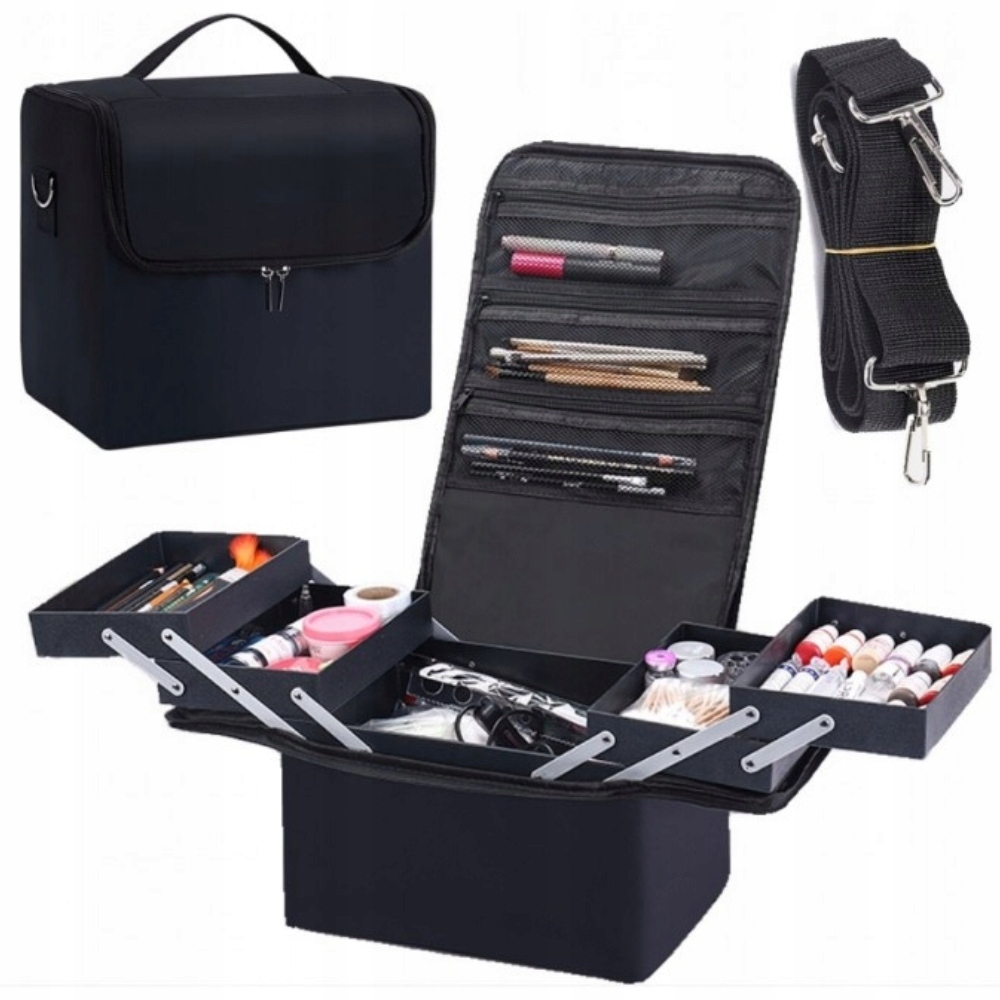 Organizer Na Kosmetyki Pojemny Kuferek Czarny z Paskiem Kieszonki Półeczki