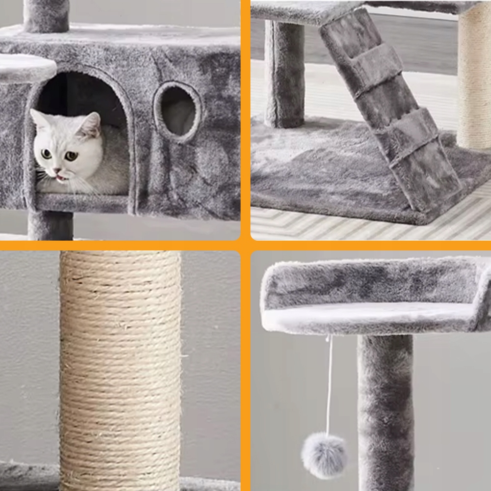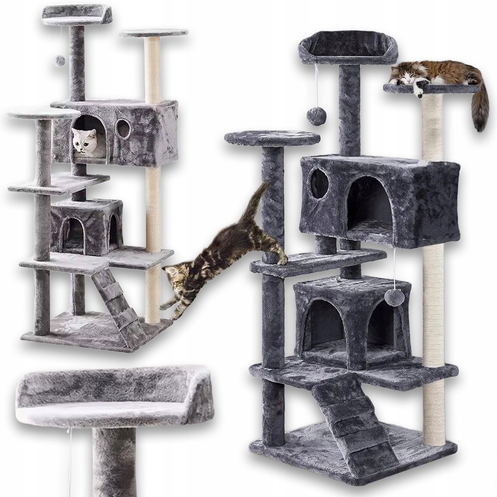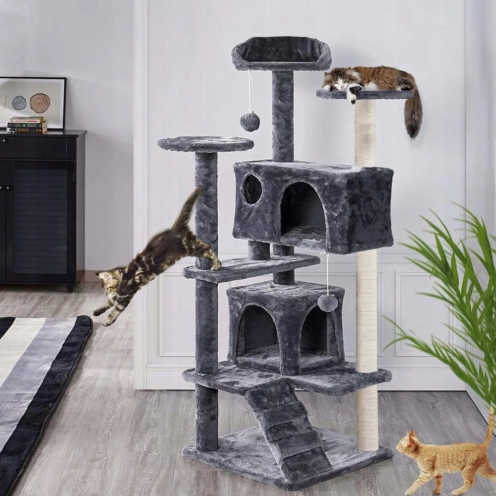 Dwa przytulne domki i miękkie półki W domku znajdują się dwa wygodne legowiska z otworami wejściowymi, które stanowią doskonałą kryjówkę dla kota. To idealne miejsca do drzemki, obserwacji otoczenia lub schowania się w chwilach spokoju. Dodatkowe półki wyściełane miękkim pluszem zachęcają do wylegiwania się i pozwalają kotu odpoczywać na różnych wysokościach.