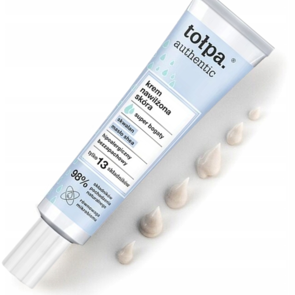 Krem Tołpa Authentic to super bogata formuła o jednoczesnej maksymalnej sile nawilżania i odbudowy. Otula skórę komfortową, ochronną barierą przed negatywnym wpływem czynników zewnętrznych. Zatrzymuje wodę w głębi naskórka, dzięki czemu zapewnia nieustanne nawilżenie, utrzymujące się nawet po umyciu twarzy. Eliminuje łuszczenie i wygładza. Pielęgnuje skórę z delikatnością i wsparciem dla mikrobiomu. Łagodzi podrażnienia i nie zaburza naturalnego pH.