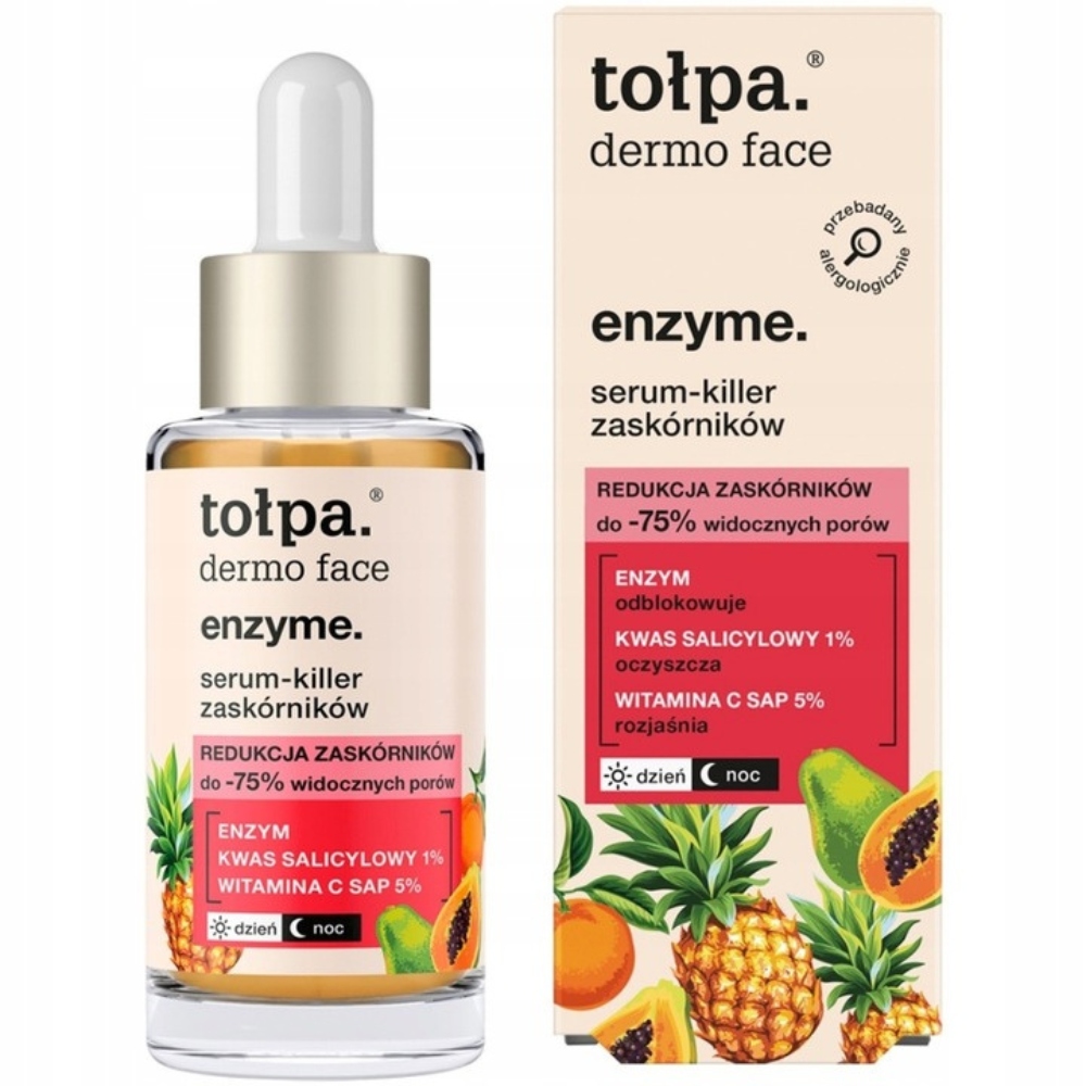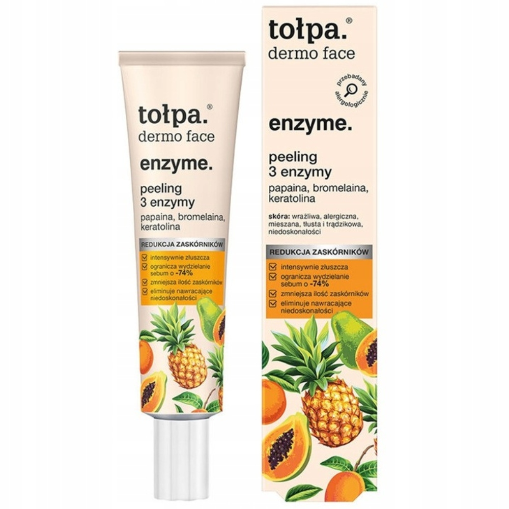 Działa jak peeling, ale nie zawiera drobinek ani kwasów AHA. Usuwa zrogowaciały naskórek dzięki trzem aktywnym enzymom, bez konieczności pocierania i bez dodatkowych podrażnień. Głęboko oczyszcza pory, zapobiega ich blokowaniu i zmniejsza ilość zaskórników. To najlepszy peeling enzymatyczny dedykowany potrzebom skóry wrażliwej oraz skłonnej do podrażnień i alergii. Produkt sprawdzi się również w pielęgnacji cery normalnej, mieszanej i tłustej. Roślinne wyciągi zawarte w peelingu enzymatycznym tołpa.® dermo face enzyme. stymulują naturalny proces odnowy naskórka. Enzymy precyzyjnie złuszczają martwe komórki, przywracając skórze blask i promienny wygląd.