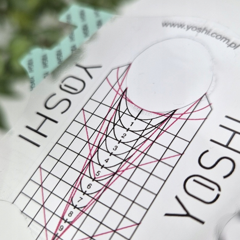 Szablony YOSHI to połączenie innowacyjnej przeźroczystej folii, niezwykle mocnego kleju i precyzyjnych linii pomocniczych, dzięki czemu każde przedłużenie jest stabilne i precyzyjne – bez kompromisów. Doskonale ułatwiają dopasowanie do paznokcia oraz precyzyjną budowę migdała, kwadratu i sztyletu. Szablony wykonane są z wysokiej jakości folii PCV, co sprawia, że są sztywniejsze niż papierowe formy, łatwo dopasowują się do palca i nie marszczą się podczas pracy.